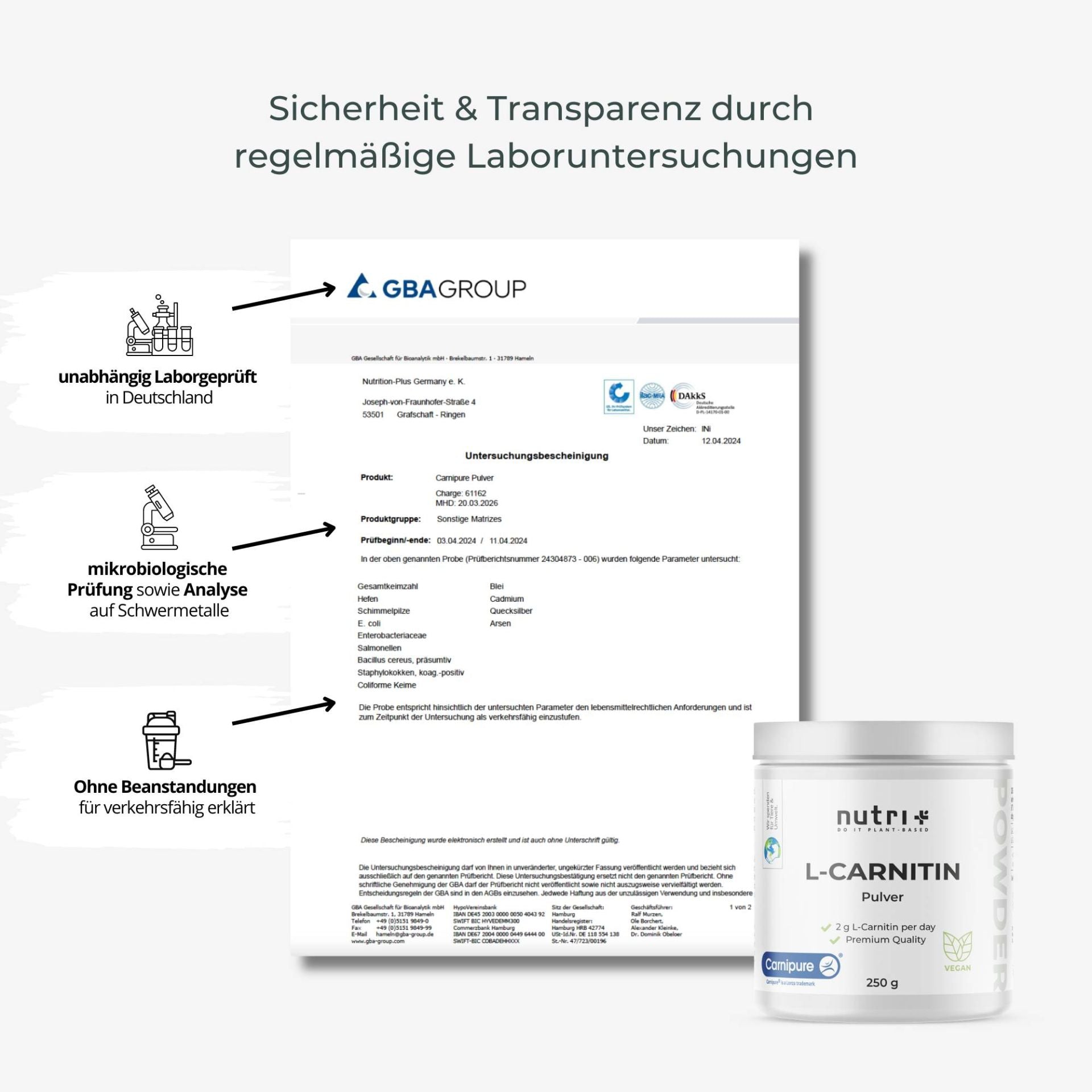 Unser nutri+ L-Carnitin Pulver ist selbstverständlich glutenfrei und zu 100 % vegan. Es besteht zu aus reinem L-Carnitin Tartrat (Carnipure®), ganz ohne Füllstoffe, Farbstoffe, Trennmittel oder andere Zusätze. Der Markenname Carnipure® der Firma Lonza steht für bestmögliche Qualität. Das Schweizer Biowissenschaftsunternehmen Lonza zählt zu den weltweit führenden und zuverlässigsten Anbietern von L-Carnitin.